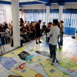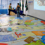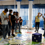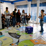 Depois disso, os jovens e adolescentes participam de um jogo de tabuleiro em tamanho real, onde são desafiados a responderem perguntas relacionadas ao tema tratado no workshop.